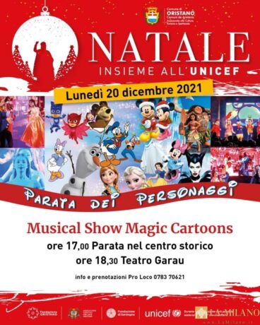 Oristano, i più noti personaggi della Disney lunedì 20 dicembre sfileranno nel centro storico di Oristano e si ritroveranno al Teatro Garau per la gioia dei bambini. Il “Musical show magic cartoons” è organizzato nell’ambito delle manifestazioni del “Natale insieme all’Unicef” e si aprirà alle 17 in piazza Eleonora con la parata dei personaggi Disney […]