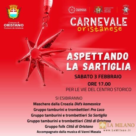 Oristano, Carnevale si apre con la manifestazione “Aspettando Sa Sartiglia” Sabato 3 febbraio, dalle 17, a Oristano, il carnevale 2024 si apre con la manifestazione “Aspettando Sa Sartiglia”. Nelle piazze e vie del Centro storico sfileranno le maschere della Croazia “Didi s Kamesnice”. Insieme a loro il Gruppo tamburini Pro loco, il Gruppo tamburini Sa […]