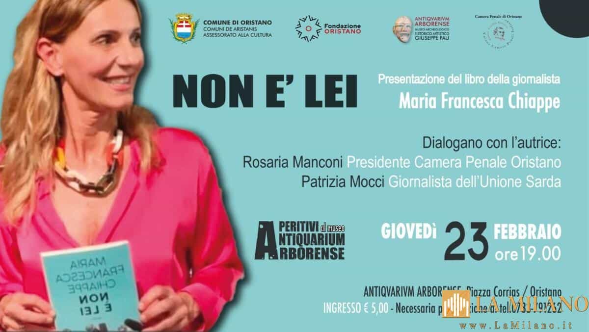 Giovedì 23 febbraio, l’Assessorato alla Cultura del Comune di Oristano, in collaborazione con la Fondazione Oristano e la Camera Penale di Oristano, organizzano un aperitivo culturale con la presentazione del libro “Non è lei” di Maria Francesca Chiappe. L’opera, ambientata sulla spiaggia di Villasimius, è un giallo che trascina il lettore in un angolo di mare zaffiro della Sardegna. Durante l’evento, la Presidente della Camera penale di Oristano Rosaria Manconi e la giornalista dell’Unione Sarda Patrizia Mocci dialogheranno con l’autrice.